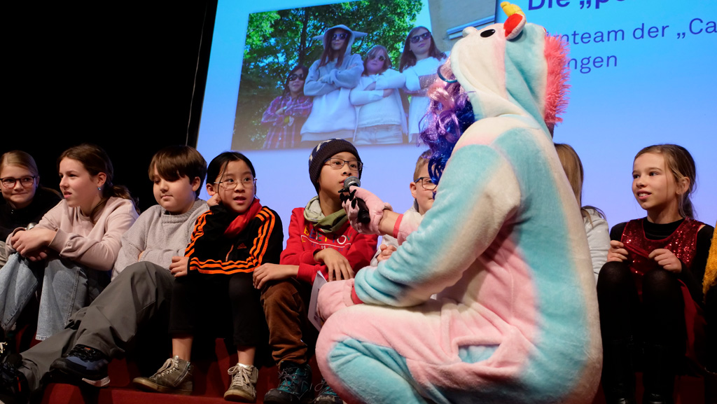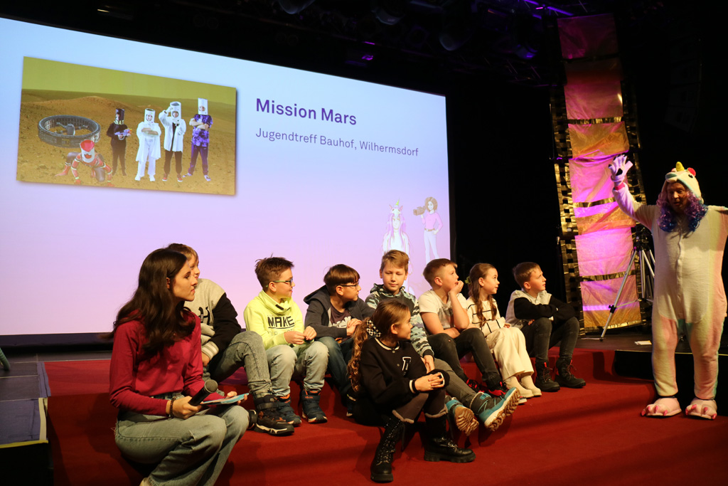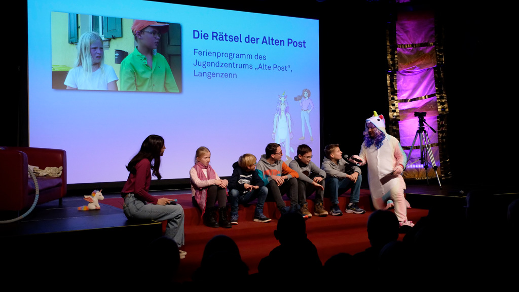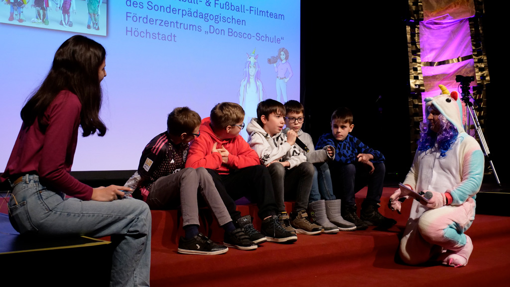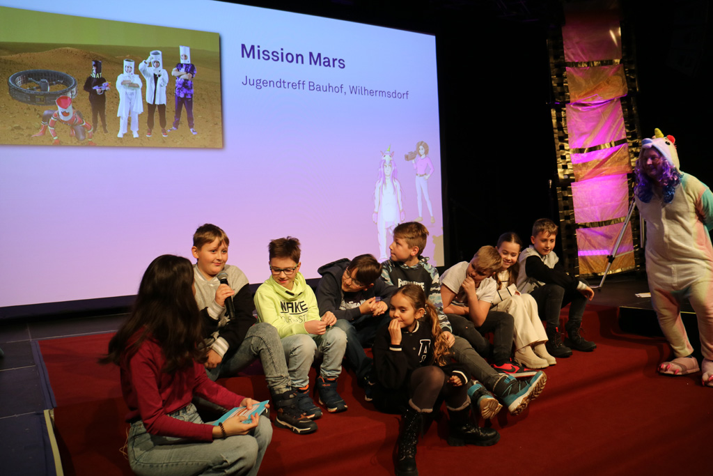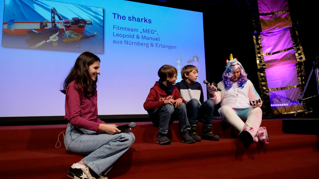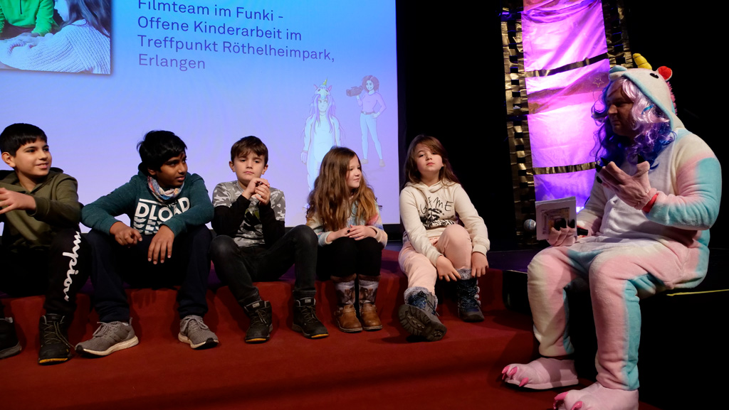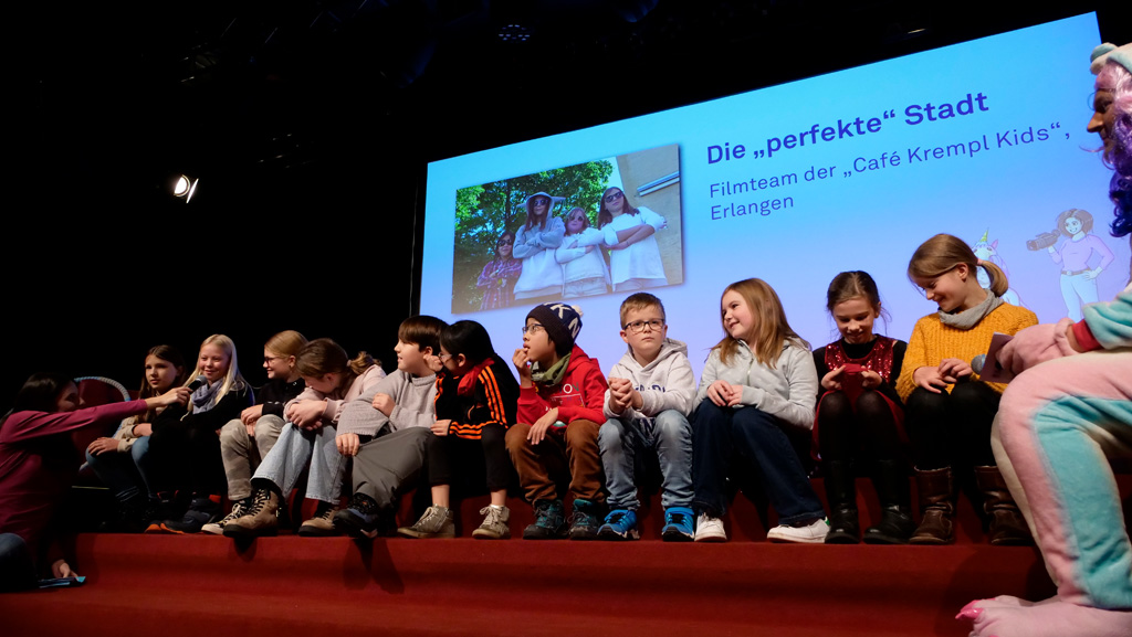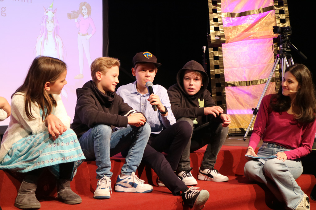 Zahlreiche Filmgruppen berichteten von ihren Filmproduktionen und insgesamt 27 Filme von Kindern für Kinder wurden auf der großen Leinwand präsentiert. Eingerahmt in einen actionreiches Moderationsprogramm, bei dem die Kinder im Saal zum Mitmachen animiert wurden, und laut bei der T-Shirt-Challanges der VIPs mitzählten.