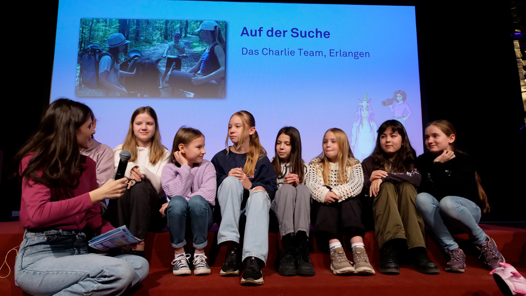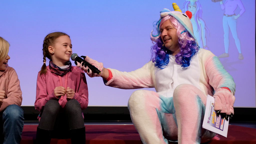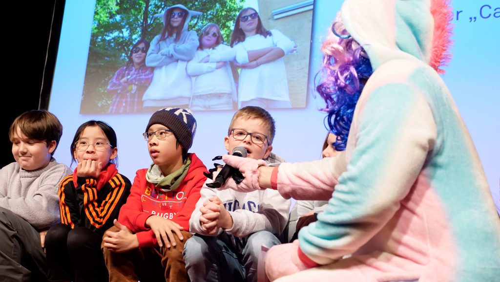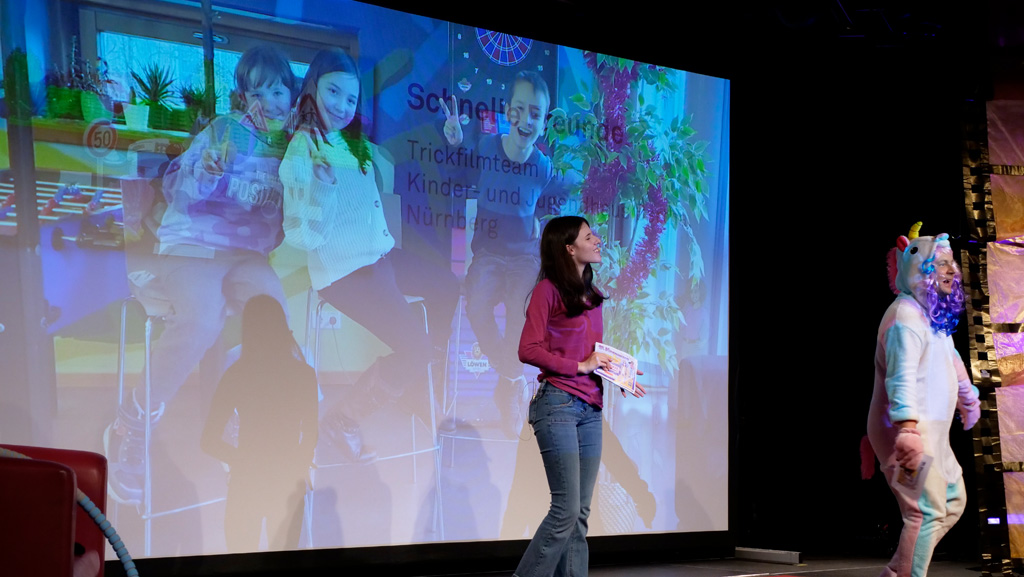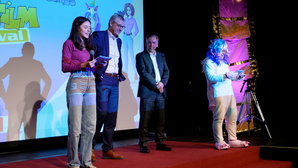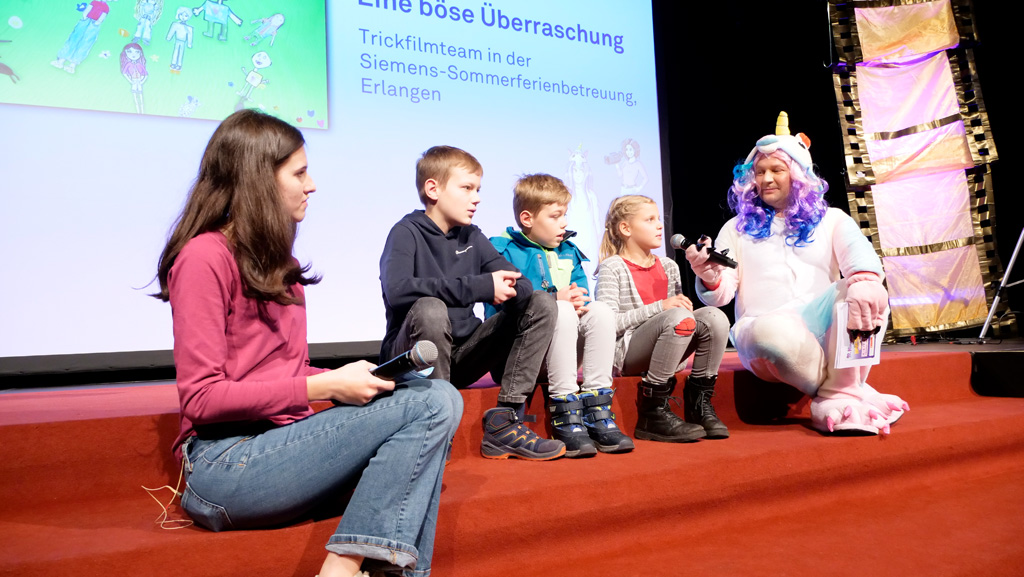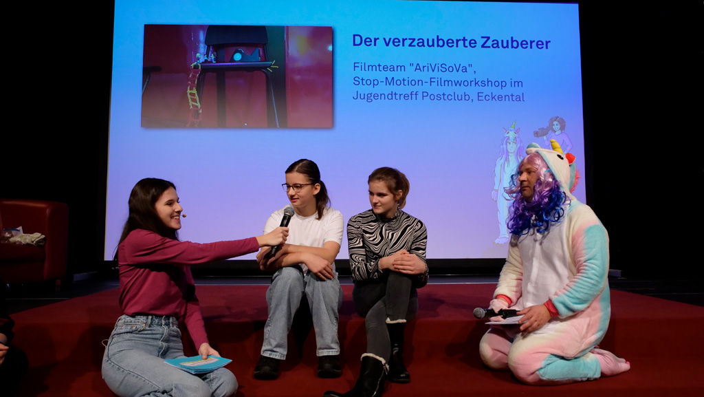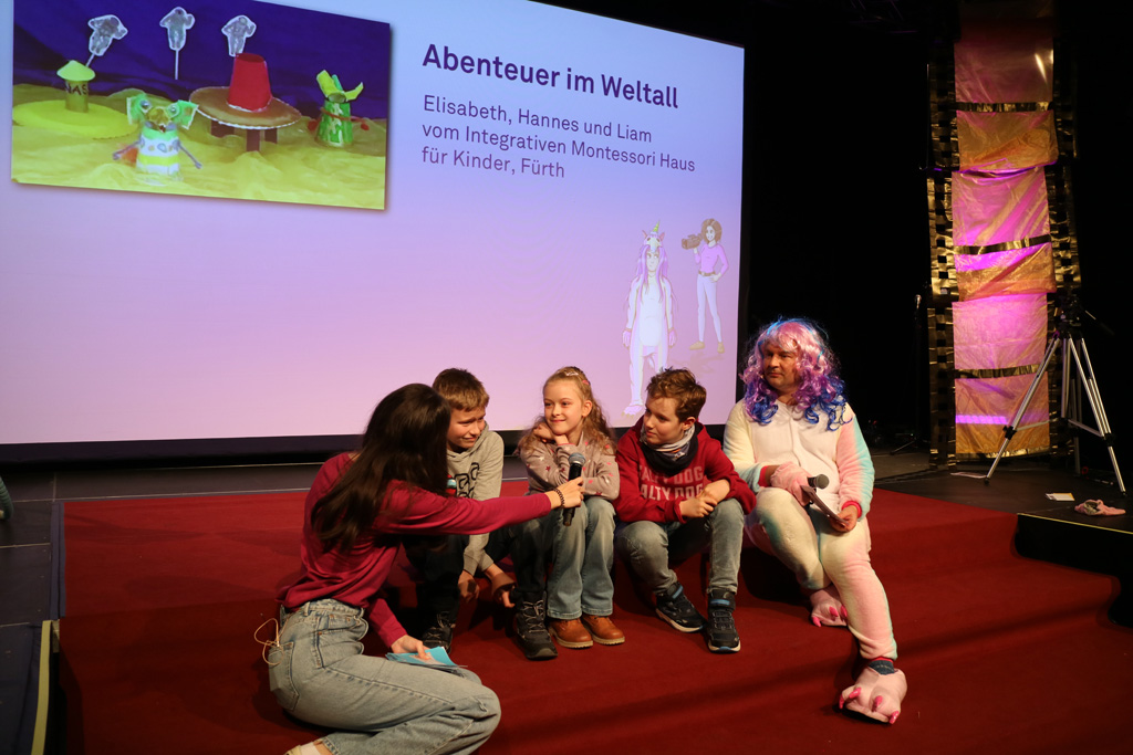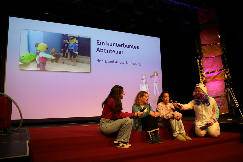 Zahlreiche Filmgruppen berichteten von ihren Filmproduktionen und insgesamt 27 Filme von Kindern für Kinder wurden auf der großen Leinwand präsentiert. Eingerahmt in einen actionreiches Moderationsprogramm, bei dem die Kinder im Saal zum Mitmachen animiert wurden, und laut bei der T-Shirt-Challanges der VIPs mitzählten.