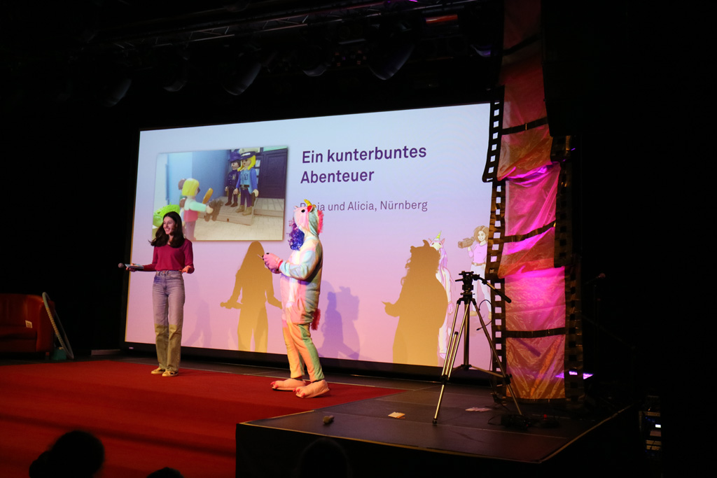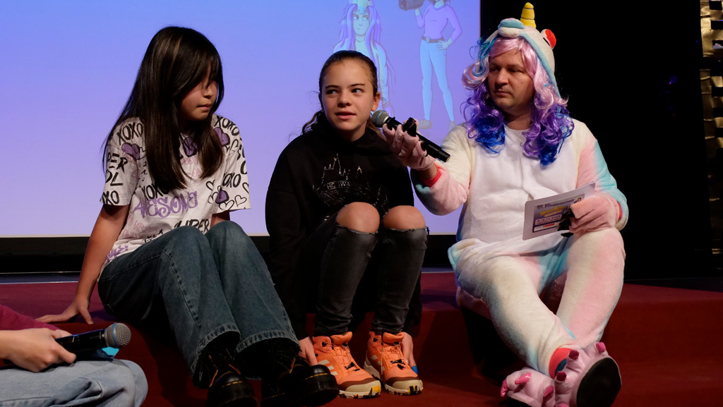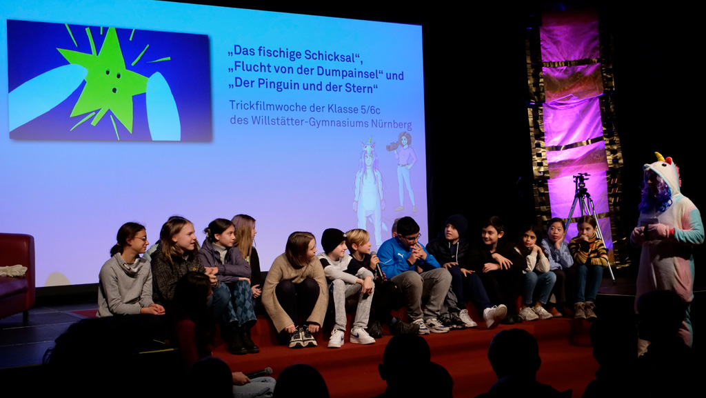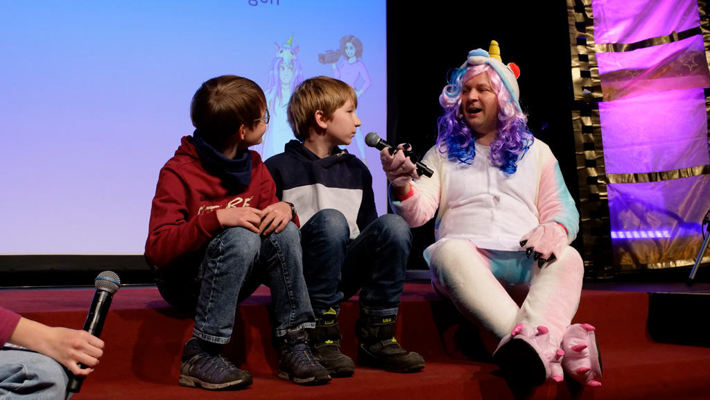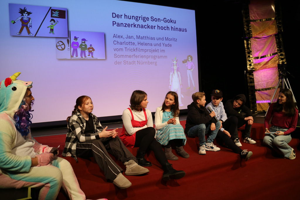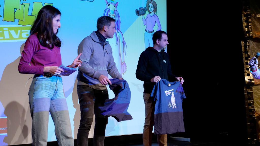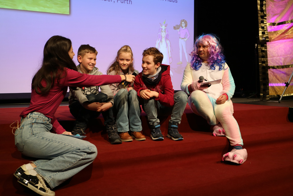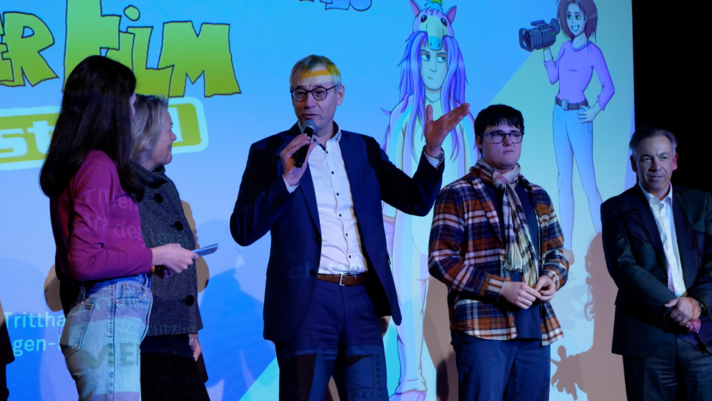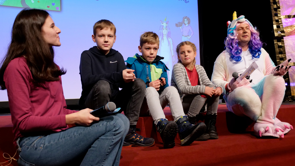 Zahlreiche Filmgruppen berichteten von ihren Filmproduktionen und insgesamt 27 Filme von Kindern für Kinder wurden auf der großen Leinwand präsentiert. Eingerahmt in einen actionreiches Moderationsprogramm, bei dem die Kinder im Saal zum Mitmachen animiert wurden, und laut bei der T-Shirt-Challanges der VIPs mitzählten.