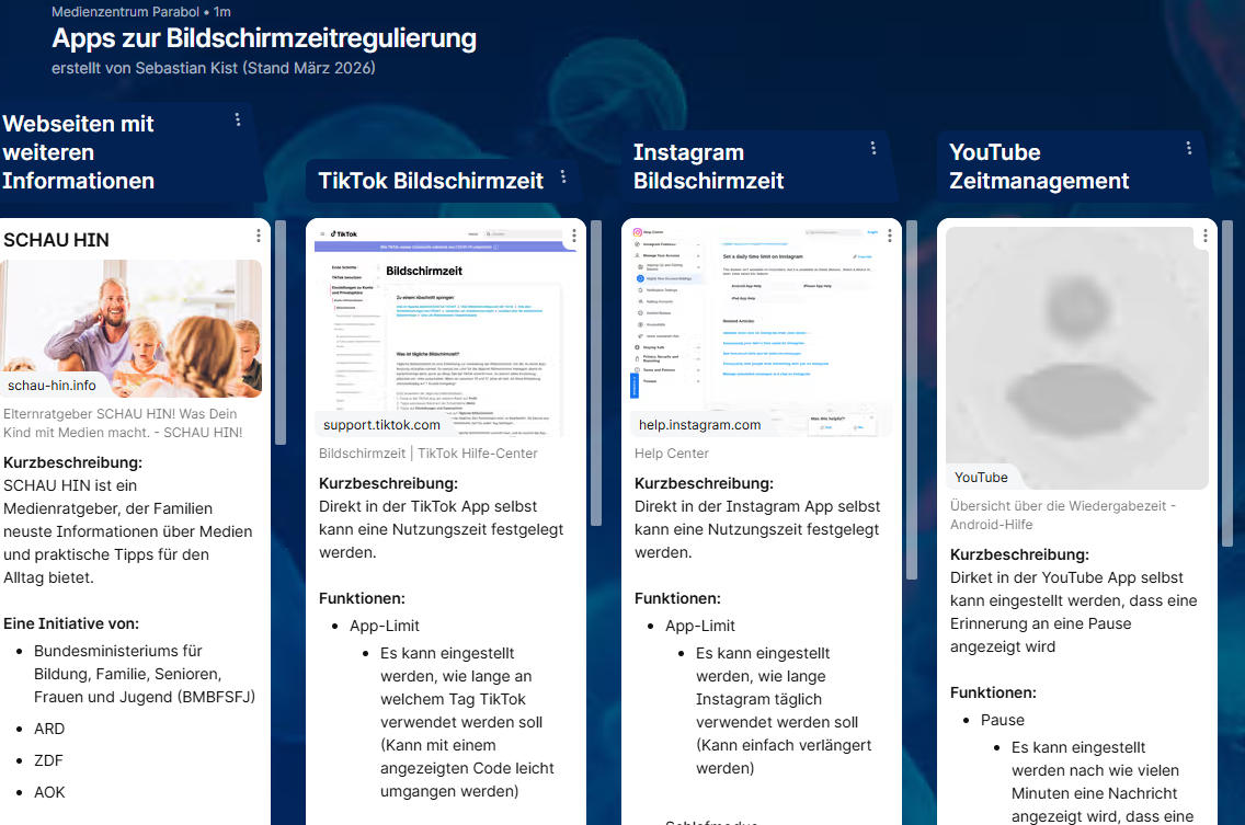 Unsere neue digitale Pinnwand gibt einen Überblick über aktuelle Tools sowie Apps zur Bildschirmzeitregulierung auf den unterschiedlichen Plattformen. Auch Tipps zu weiterführenden Webseiten, die sich mit dem Thema „Digital Detox“ auseinandersetzen sind hier zu finden.