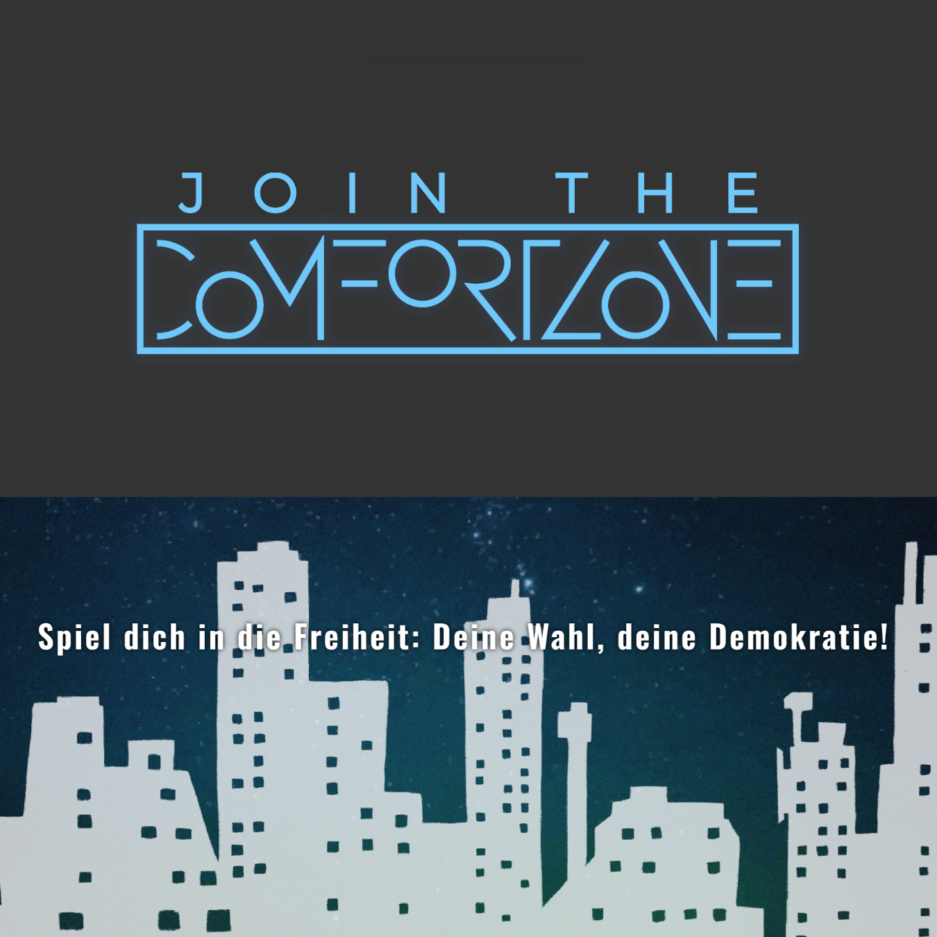 JOIN THE COMFORTZONE ist ein Browser-Game, das auf allen mobilen Endgeräten gespielt werden kann und zum Nachdenken anregen soll. Die Spielenden treffen in einem autoritären Zukunftsstaat schwierige Entscheidungen zwischen Demokratie und Diktatur, Macht und Moral. JOIN THE COMFORTZONE ist für alle ab 14 Jahre.