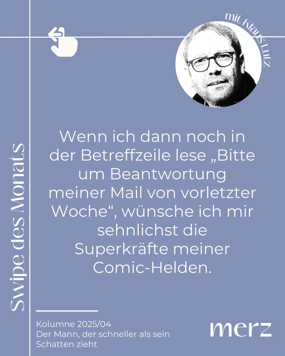 „Der Mann, der schneller als sein Schatten zieht“ Klaus Lutz ist großer Comic-Fan und wüncht sich manmal Superkräfte, wie seine Held*innen…