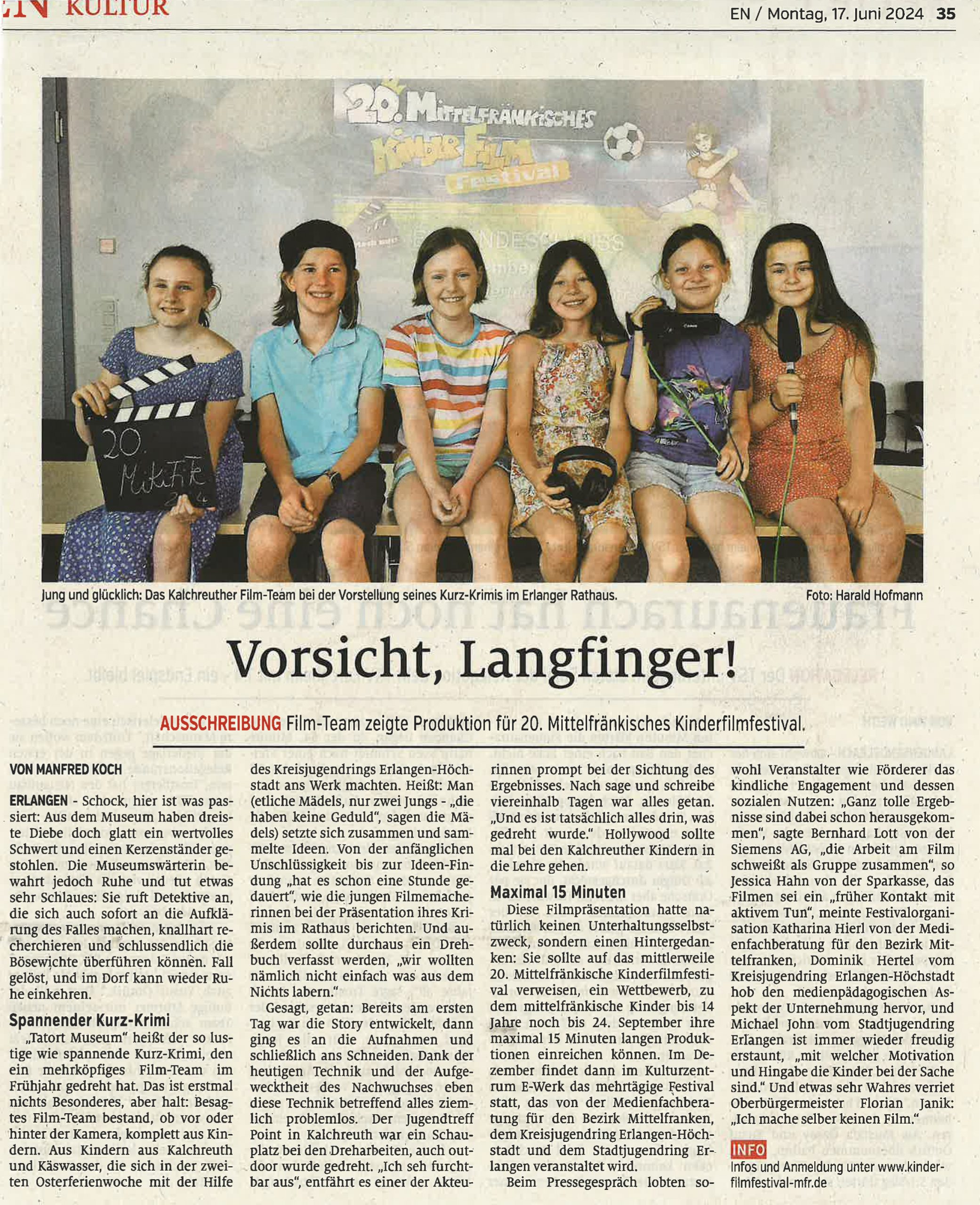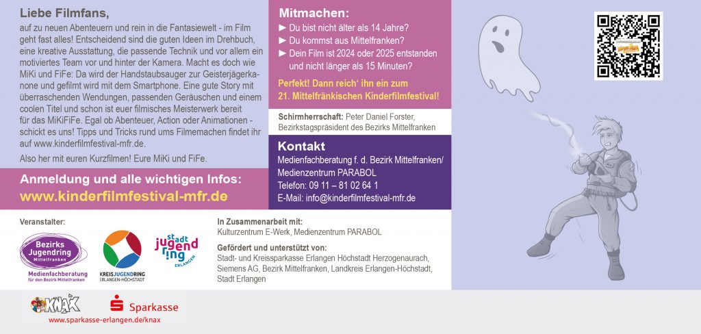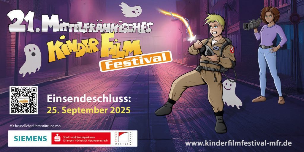 Auf zu neuen Abenteuern und rein in die Fantasiewelt – im Film geht fast alles! Entscheidend sind die guten Ideen im Drehbuch, eine kreative Ausstattung, die passende Technik und vor allem ein motiviertes Team vor und hinter der Kamera. Macht es doch wie MiKi und FiFe: Da wird der Handstaubsauger zur Geisterjägerkanone und filmen geht auch mit dem Smartphone. Eine gute Story mit überraschenden Wendungen, passenden Geräuschen und einem coolen Titel und schon ist euer filmisches Meisterwerk bereit für das MiKiFiFe. Egal ob Abenteuer, Action oder Animationen – schickt es uns! Viele coole Tipps und Trick, nicht nur zum Thema ‚Filme selber machen‘, und alle Infos zum Wettbewerb findet ihr auf www.kinderfilmfestival-mfr.de. Für alle Kinder bis 14 Jahren aus Mittelfranken. Einsendeschluss: 25. September 2025!