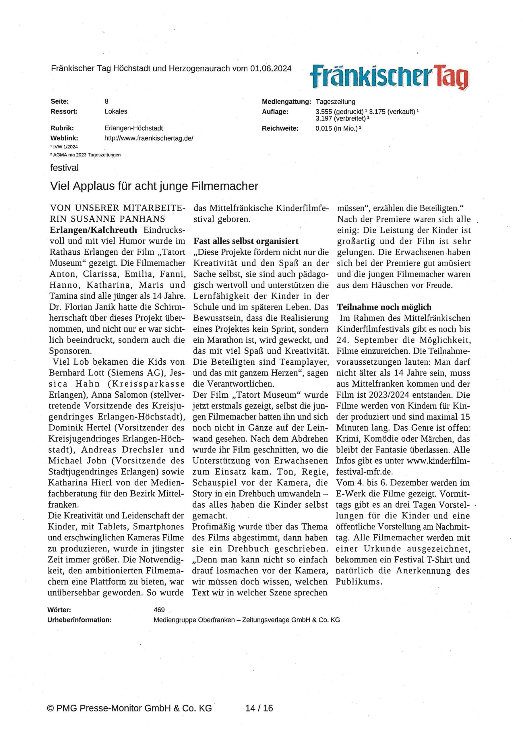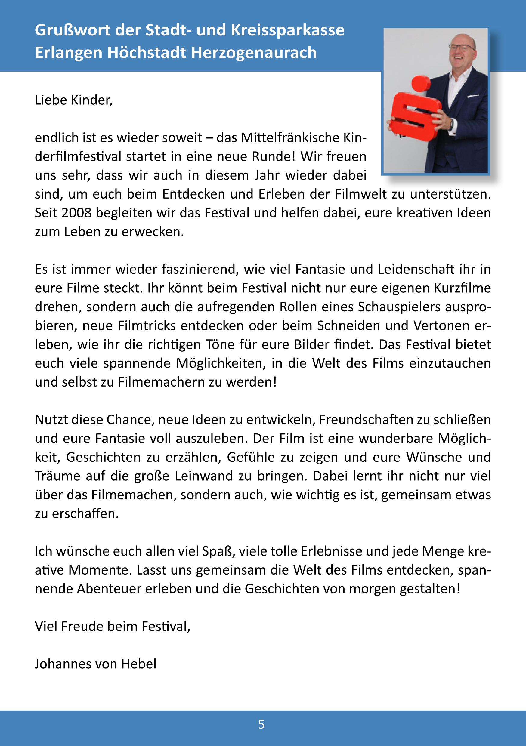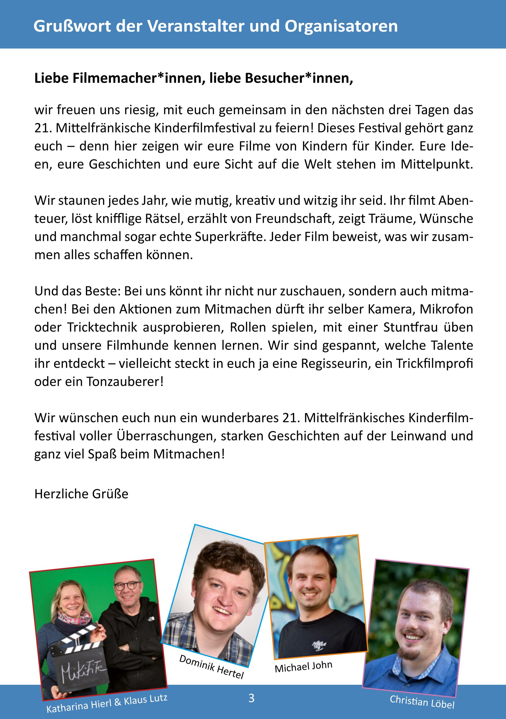 Ich möchte allen Beteiligten, sei es den jungen Regisseurinnen und Regisseuren, den unterstützenden Eltern und Lehrkräften sowie den Festivalorganisatoren, meinen herzlichsten Dank aussprechen. Ohne Ihr Engagement und Ihre Unterstützung wäre dieses Festival nicht das, was es heute ist.